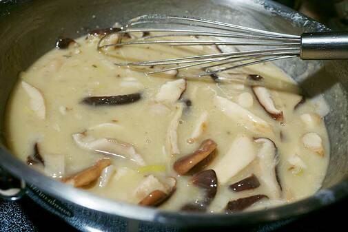 For the Velouté: In a medium sauce pan, add Snail stock (from one can Wild Burgundy Snails, Petit, Four Dozen), 2 Cups Chicken Stock, 1 Cup Water, Mushroom stems, and bits of fresh rosemary, tarragon and thyme. Bring to a boil, strain through a fine sieve and refrigerate until cold.